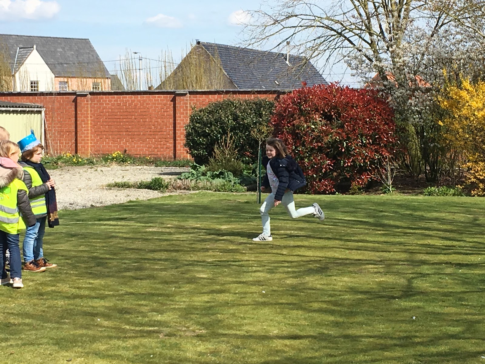 Vrijdag speelden we het paasspel. De paasklok was over onze school gevlogen maar hij had helaas zijn lading chocolade verloren. De kinderen moesten samen met juf Stephanie en juf Hanne op zoek gaan naar de chocolade. Bij elk geslaagd spelletje kregen ze een tip over de vindplaats van de chocolade.